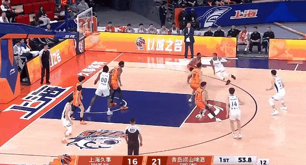 CBA常规赛,上海对阵青岛的比赛正在进行中。